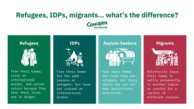 This web page from 'Concern Worldwide' gives a good explainer concerning forcibly displaced persons.